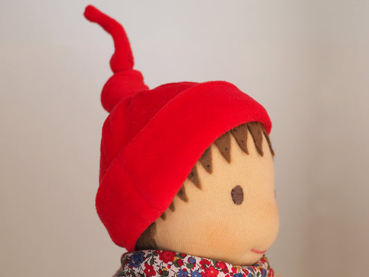 Baby is handmade in the traditional Waldorf style, filled with British lambswool and she can be undressed. Her hair is wool felt and her clothes are cotton velour. Her head is sculpted from British wool and facial feature hand embroidered. Her hair is 100% pure wool felt, cut individually and slowly stitched by hand.