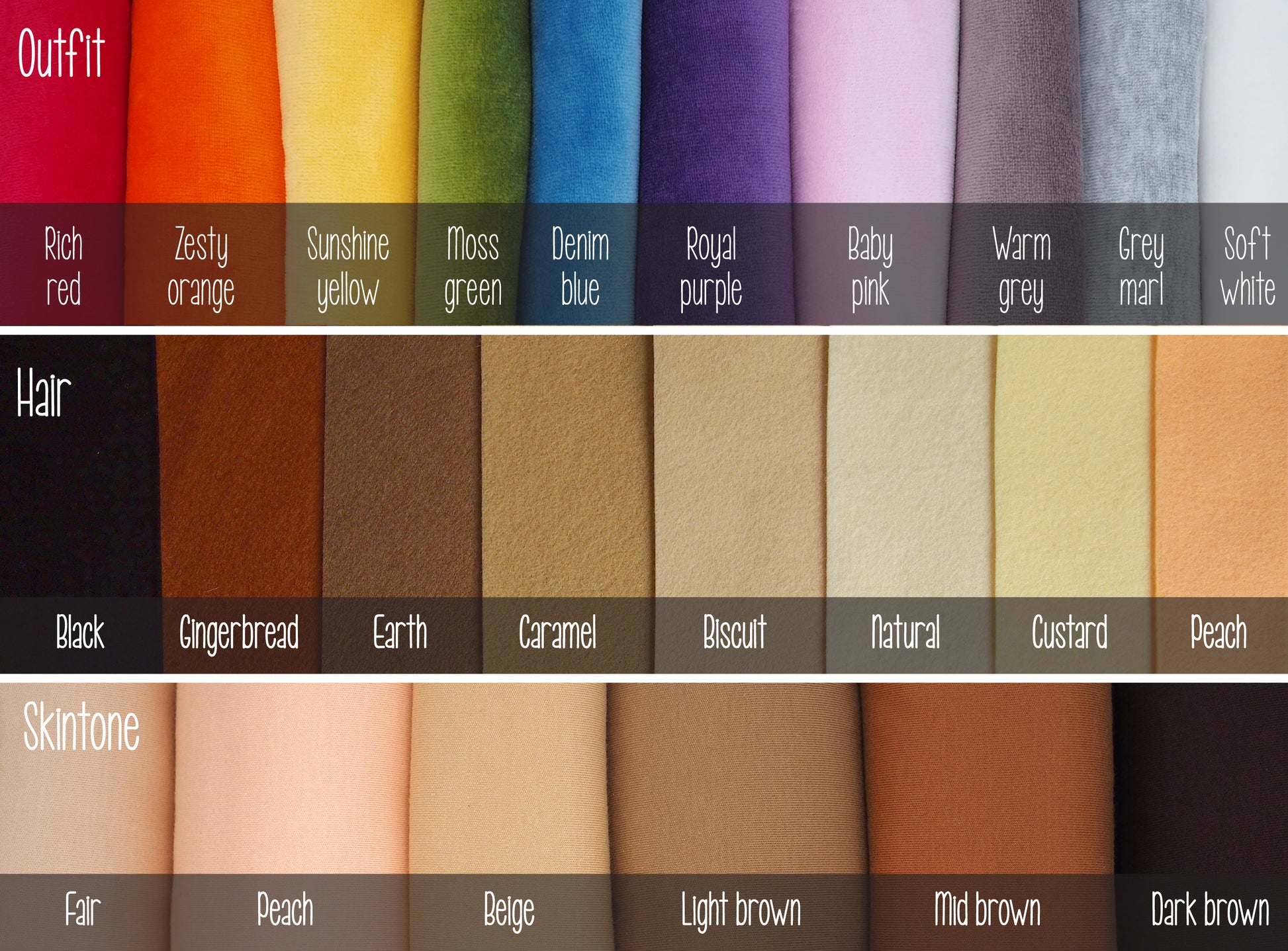 Choose from eye colours: brown, blue, green, or black. Hair colours: custard, natural, biscuit, caramel, earth, gingerbread, black, peach.