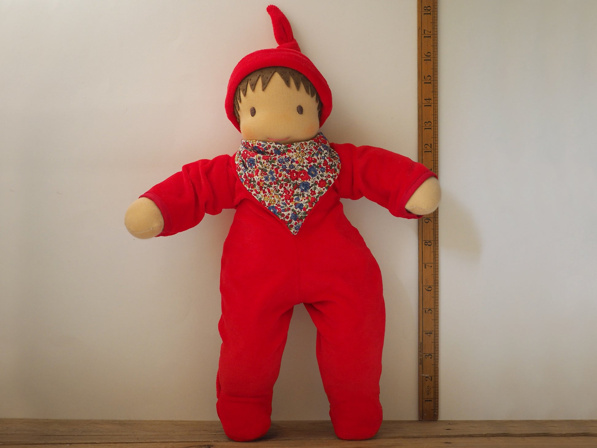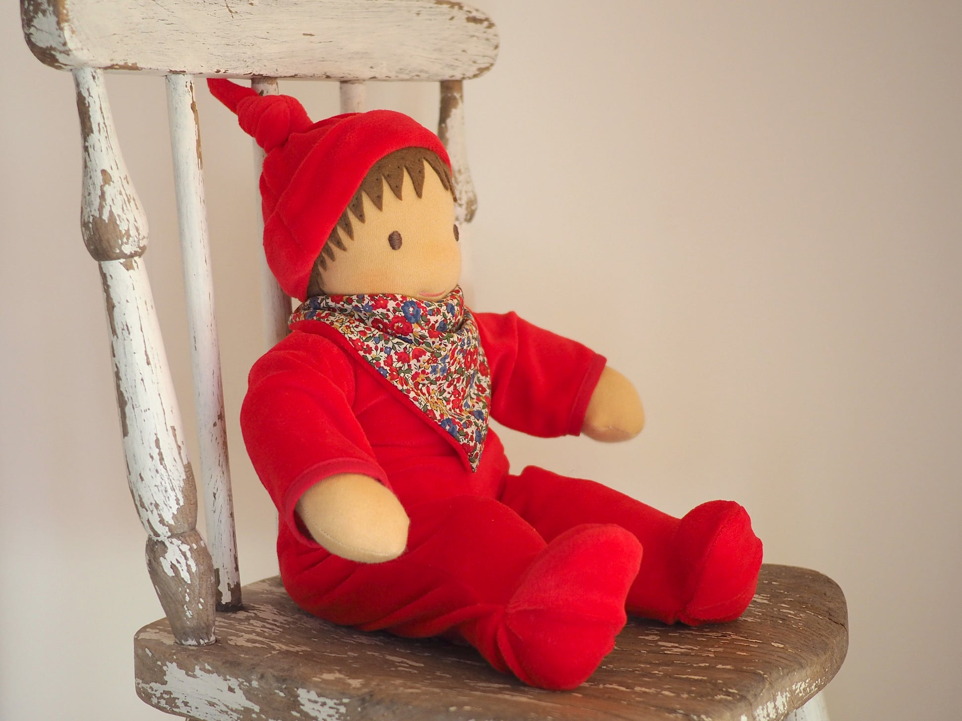 Baby is handmade by me in the traditional Waldorf style, filled with British lambswool and she can be undressed. Her hair is wool felt and her clothes are cotton velour.