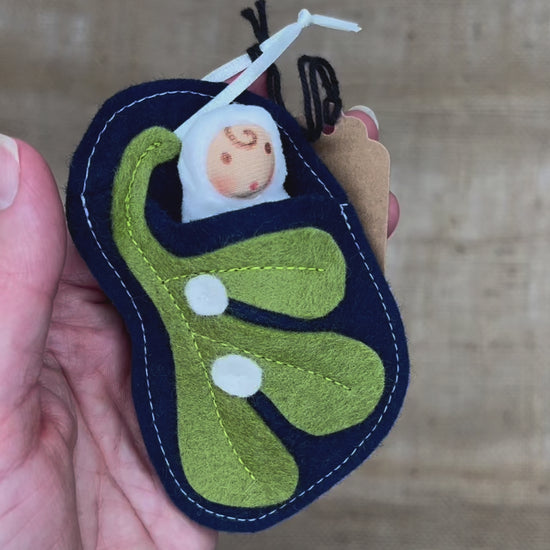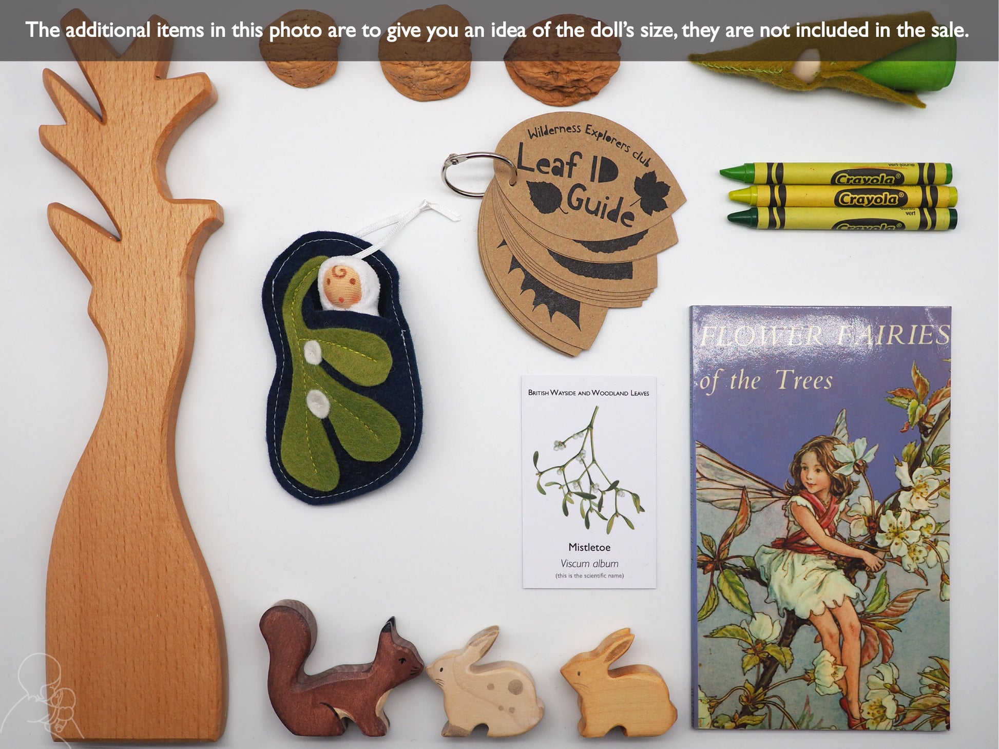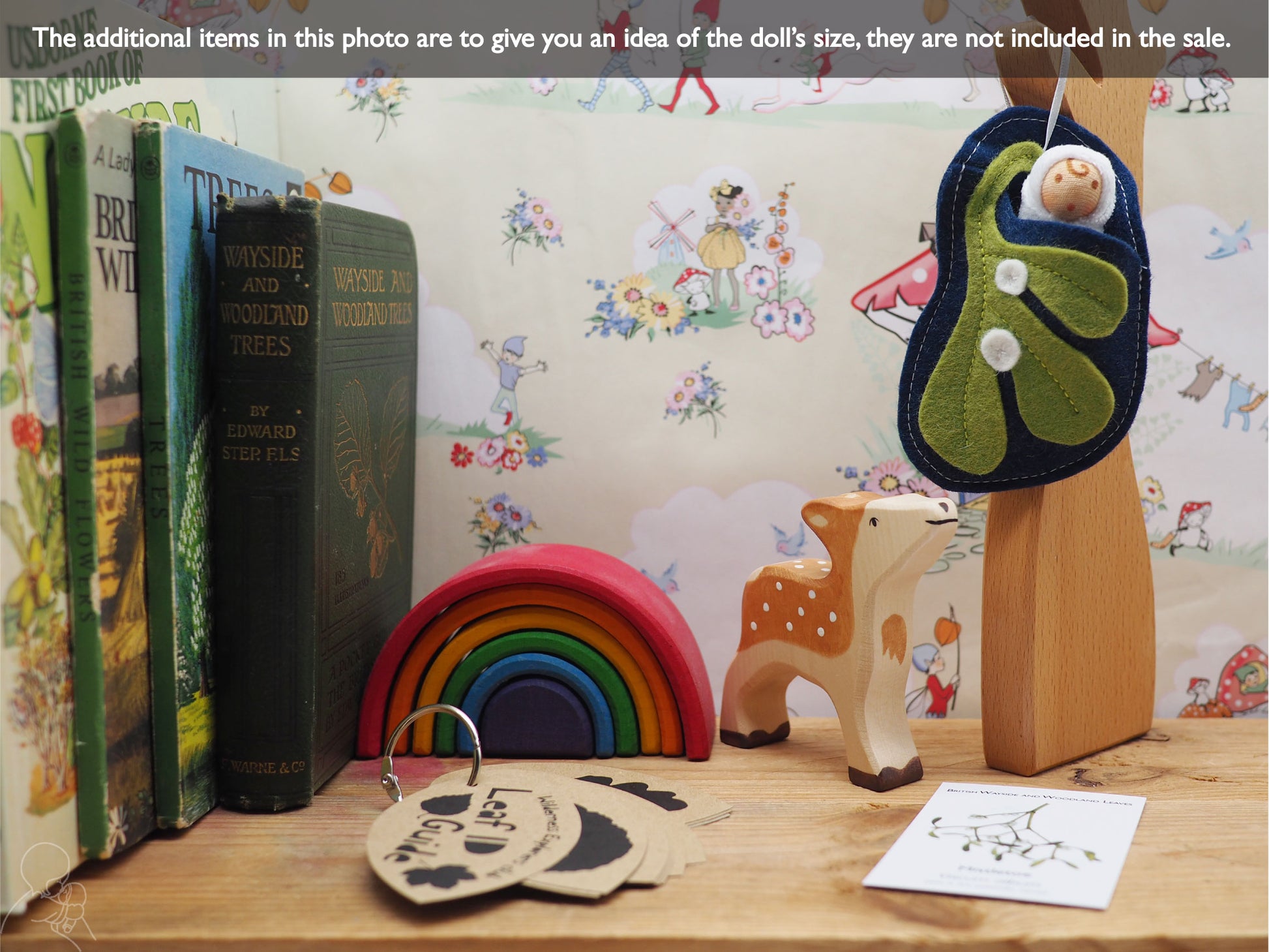 This simple doll is designed to inspire hours of nature play. The tiny doll is approximately 6.5 cm (2.5") tall, the felt pod is approximately 10.5 cm (4.25") tall.